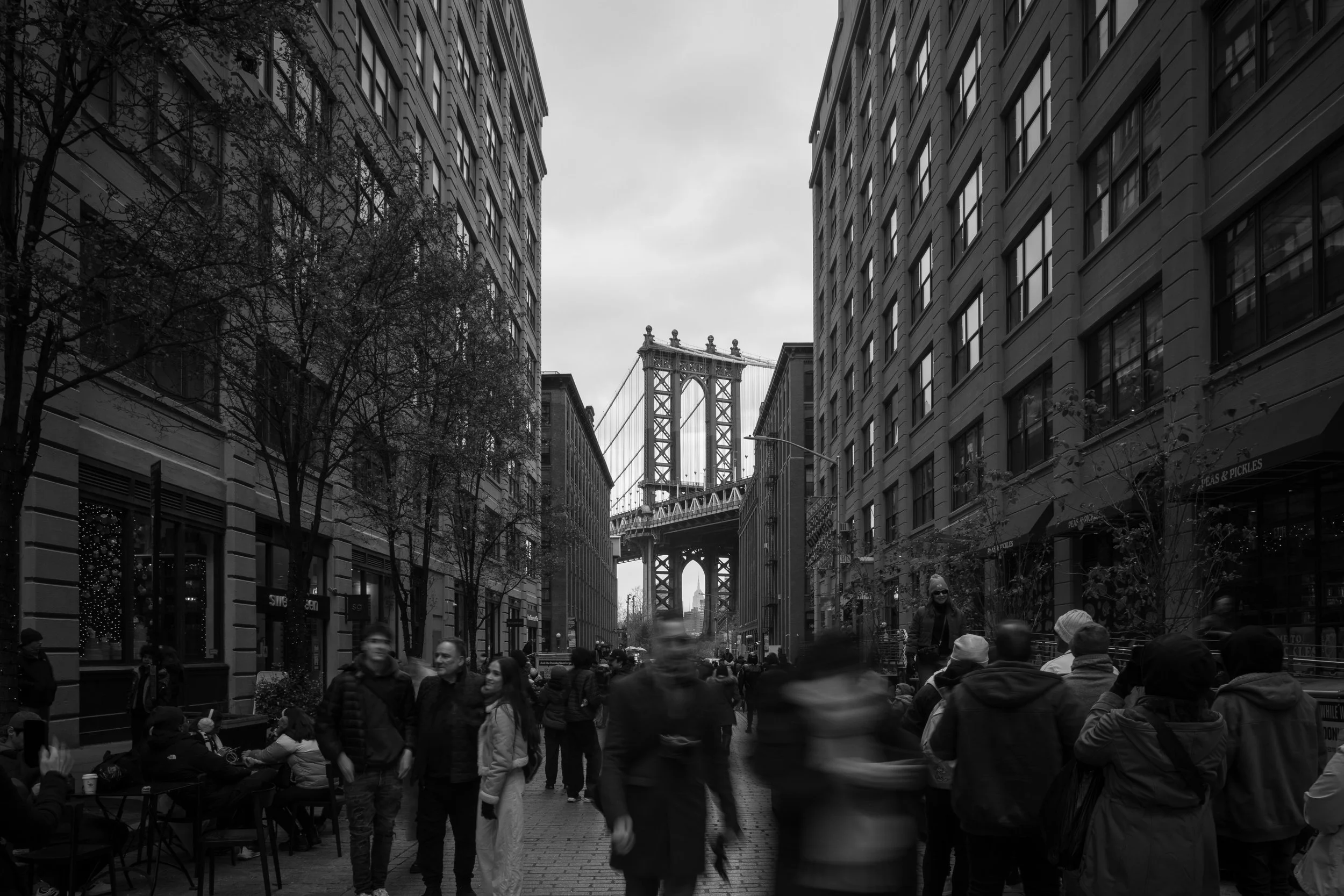 I place my tripod down, level my camera, and shift the lens upward. Not tilt, shift. Doing this with the shift movement allows me to recompose my shot without angling the camera upward. This is how the sides of the building and the structure of the bridge remain vertical and do not converge toward the top of the image. I used a polarizer, rotated to allow reflections on the windows, and used a very small aperture to obtain a long exposure. Exposure here was 1/5th of a second which causes the people to be blurred. I feel this gives a sense of rushing which I felt when I was there setting up this shot.