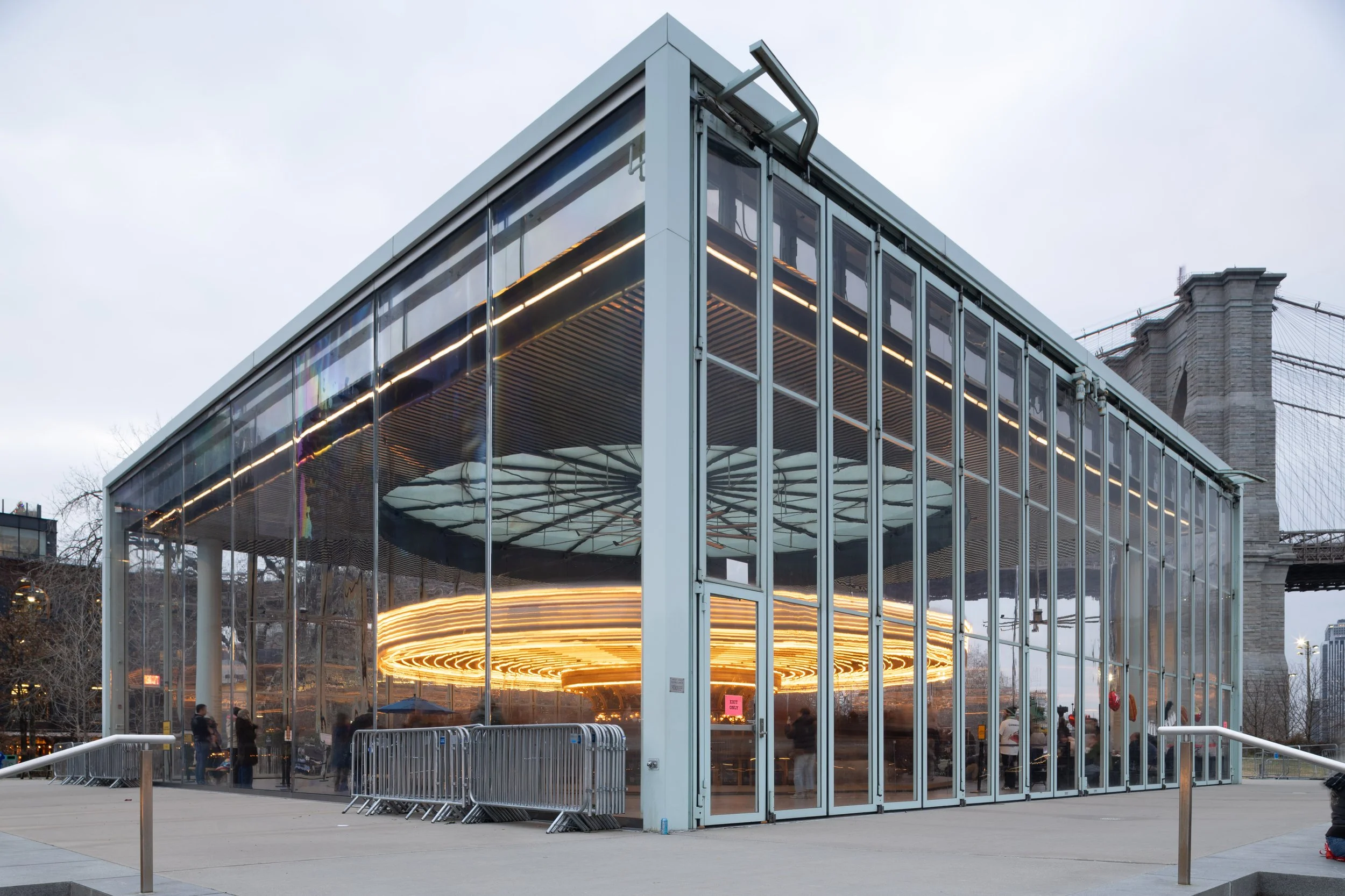 Jane’s carousel in Brooklyn Bridge park is housed in a glass building. The carousel spins and the lights create round trails in my long exposure image.